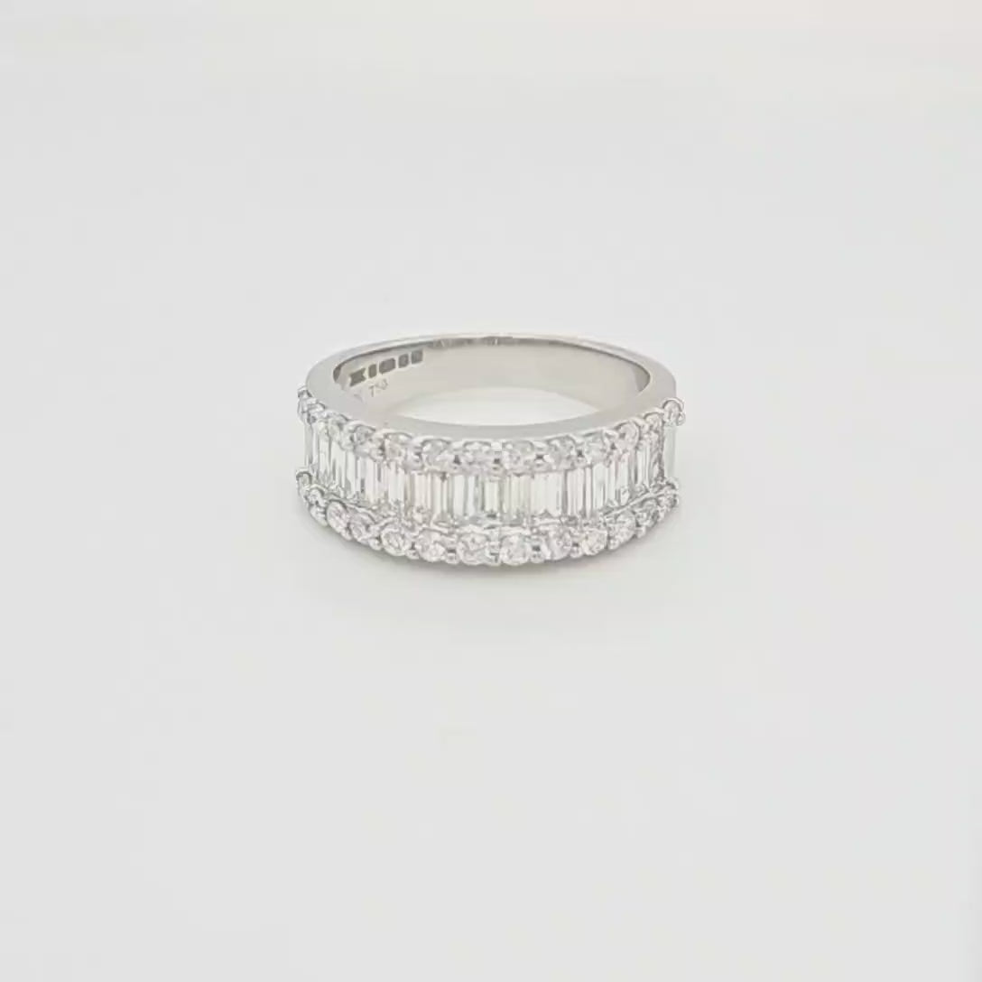 This stunning eternity ring is made up of channel set baguette cut diamonds paired with micro set round brilliant cut diamonds, totalling 2.80ct. By incorporating two cuts, the detail of this ring is further enhanced. This ring is set in a 18k white gold creating gorgeous highlights in the diamonds throughout the ring.