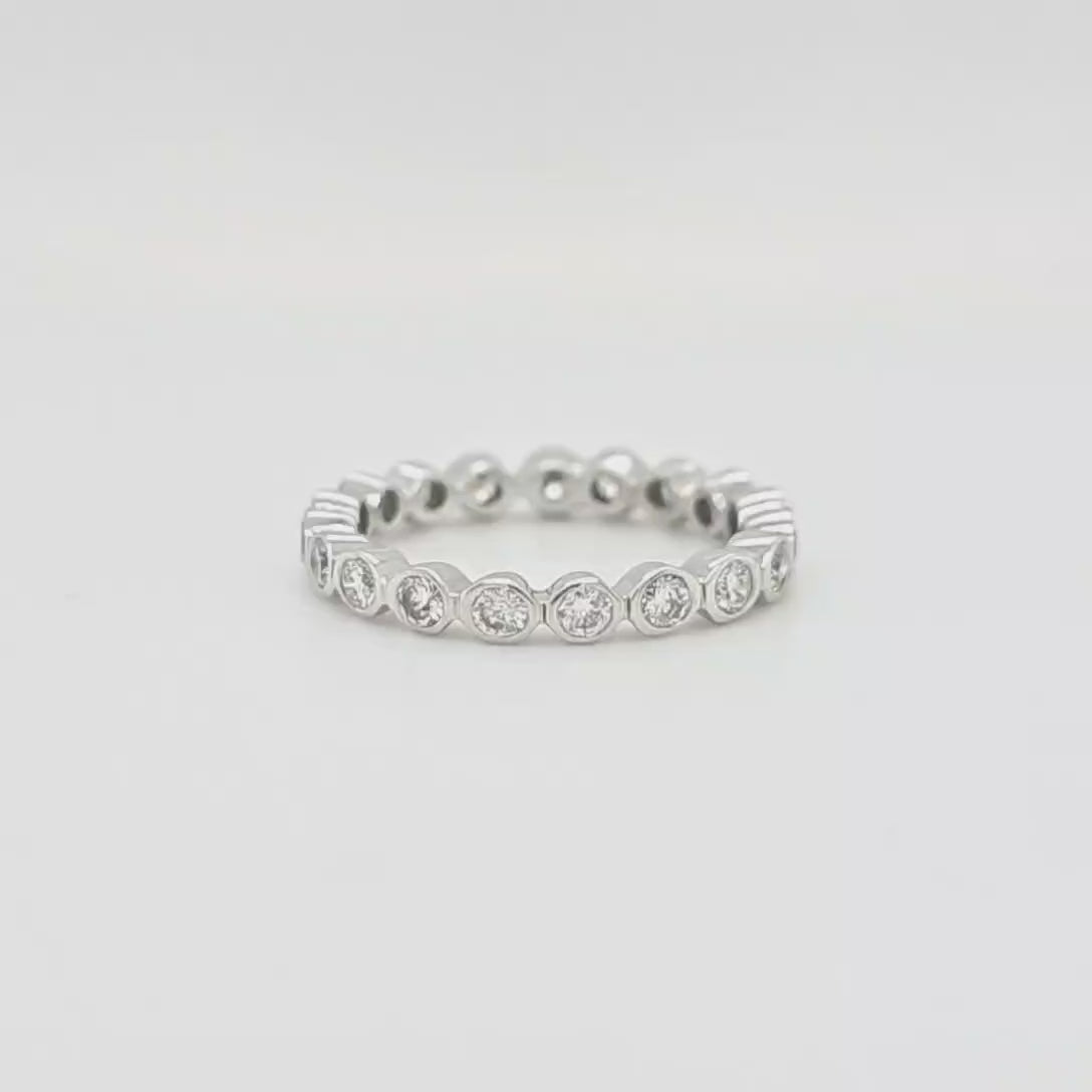 This stunning eternity ring is a timeless classic that will take your breath away. Each diamond is set using a rub over setting across the full eternity. This ring is set in a 18k white gold mould which additionally highlights the diamonds.