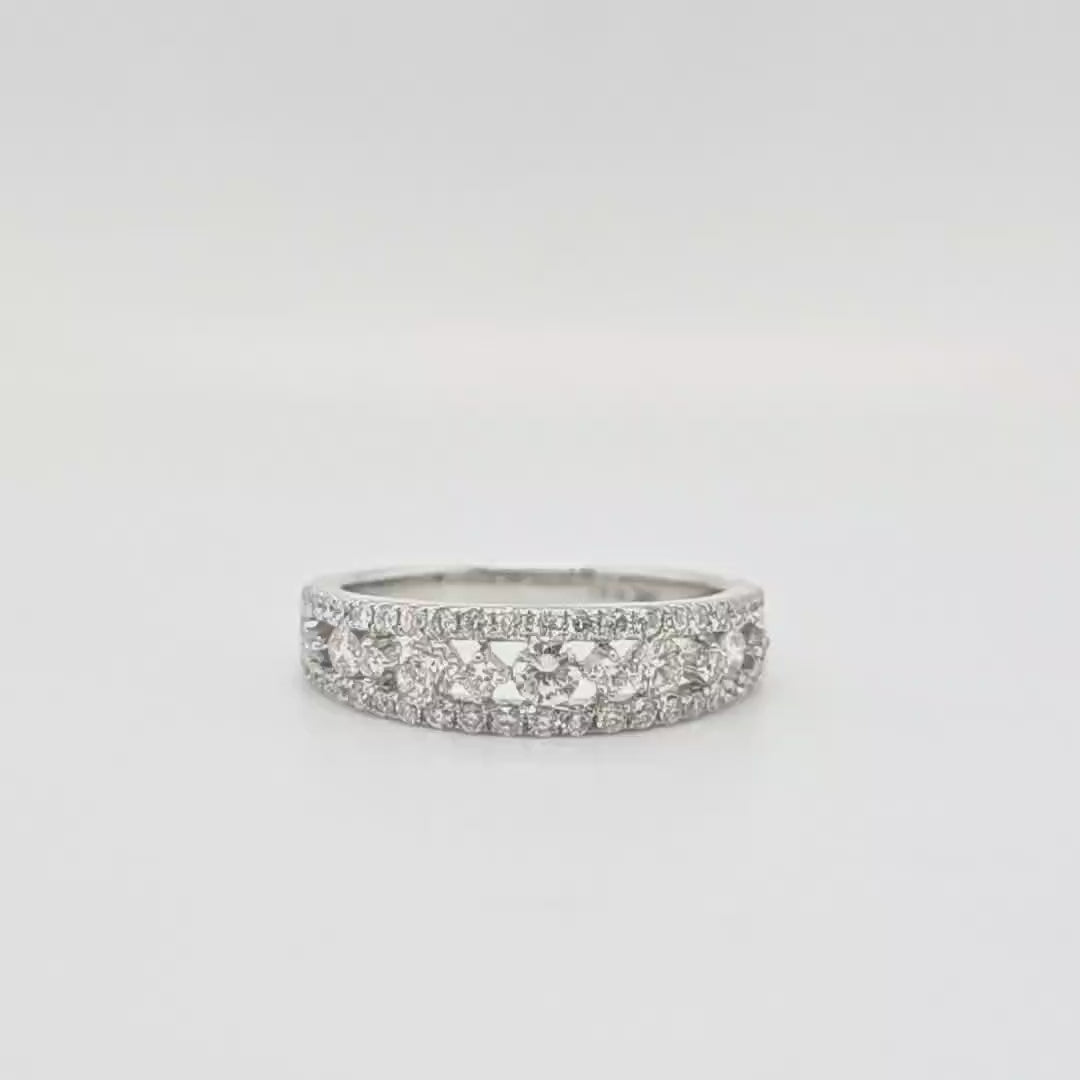 This stunning eternity ring is a timeless classic that will take your breath away. On the edges, the diamonds are set using micro setting, with the middle of the ring incorporating alternating four claw open setting and the outside using grain setting. This ring is set in a 18k white gold mould which highlight the diamonds further.