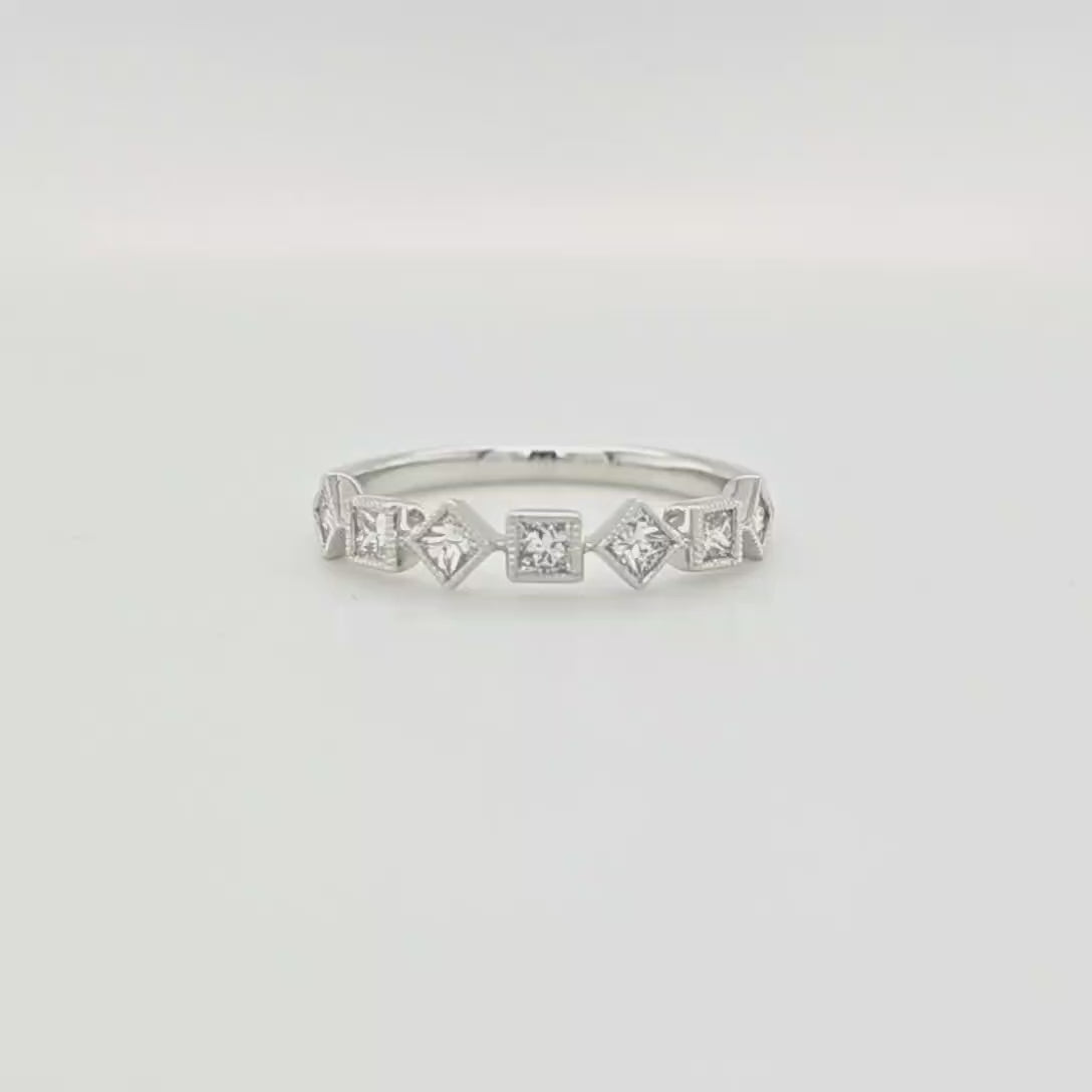 This stunning half eternity ring is a timeless classic that will take your breath away. Each diamond is set using a rub over setting with a mill grain finish, enhancing the fine detail on this ring. Each diamond is princess cut, alternating each diamond, giving a square to diamond feature. This ring is set in a 18k white gold mould which additionally highlights the diamonds.
